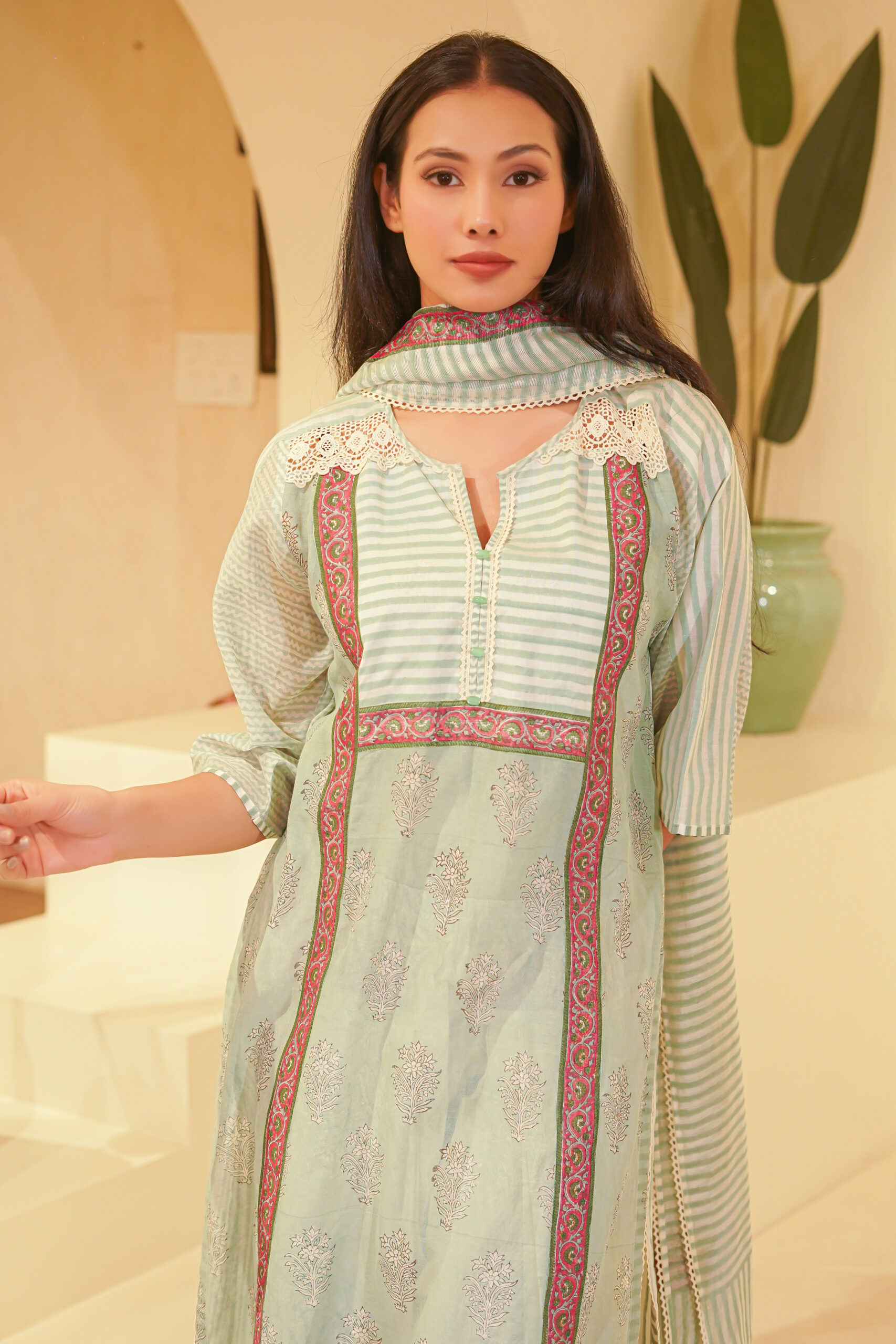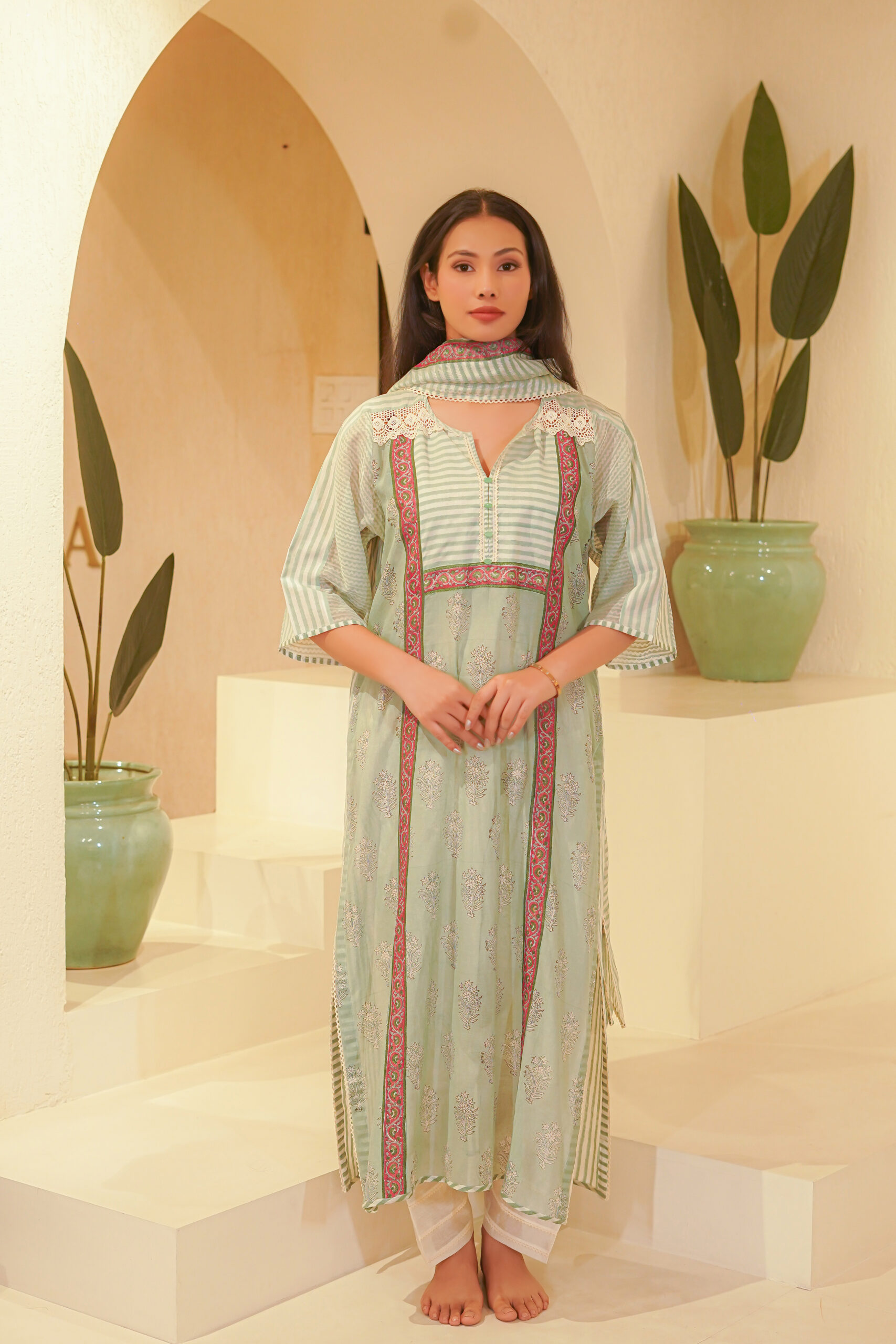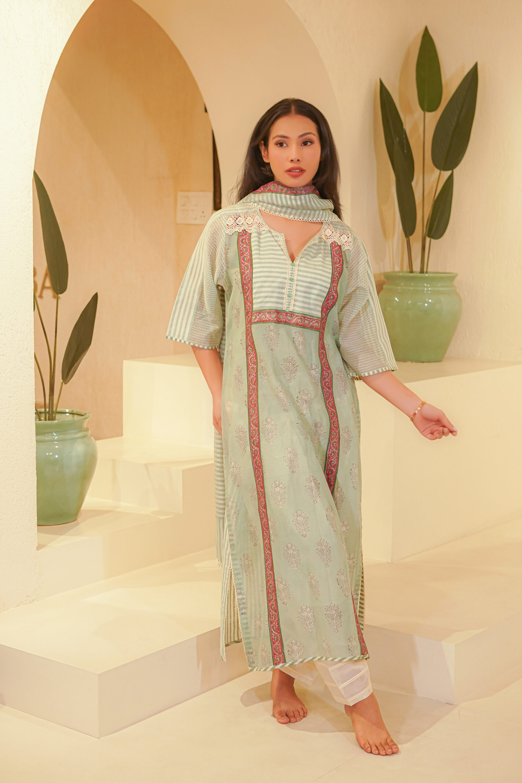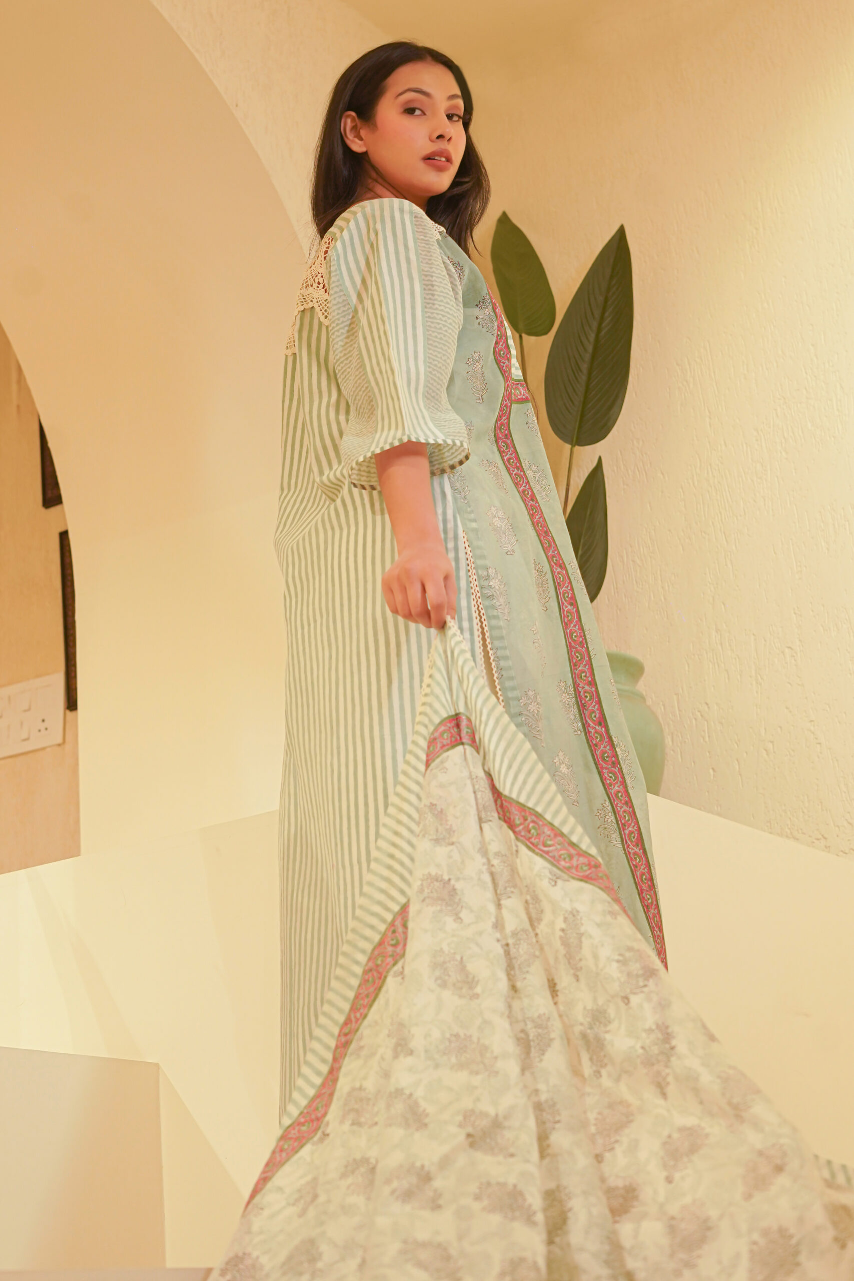 - Hand block print and lace details.