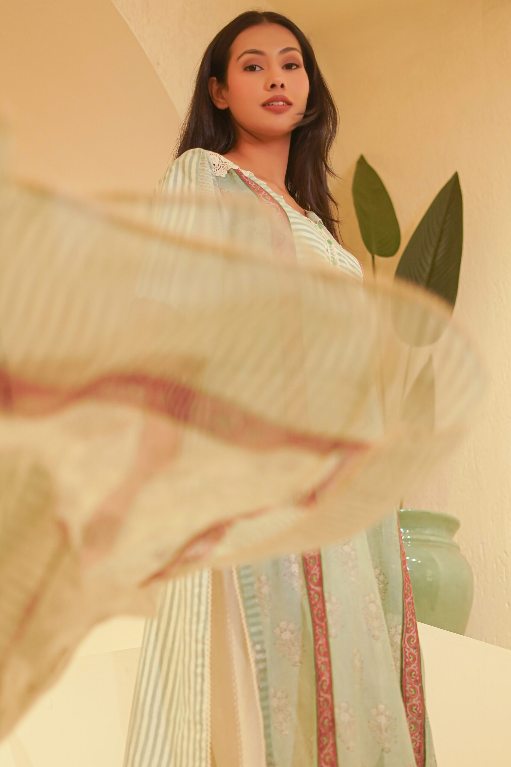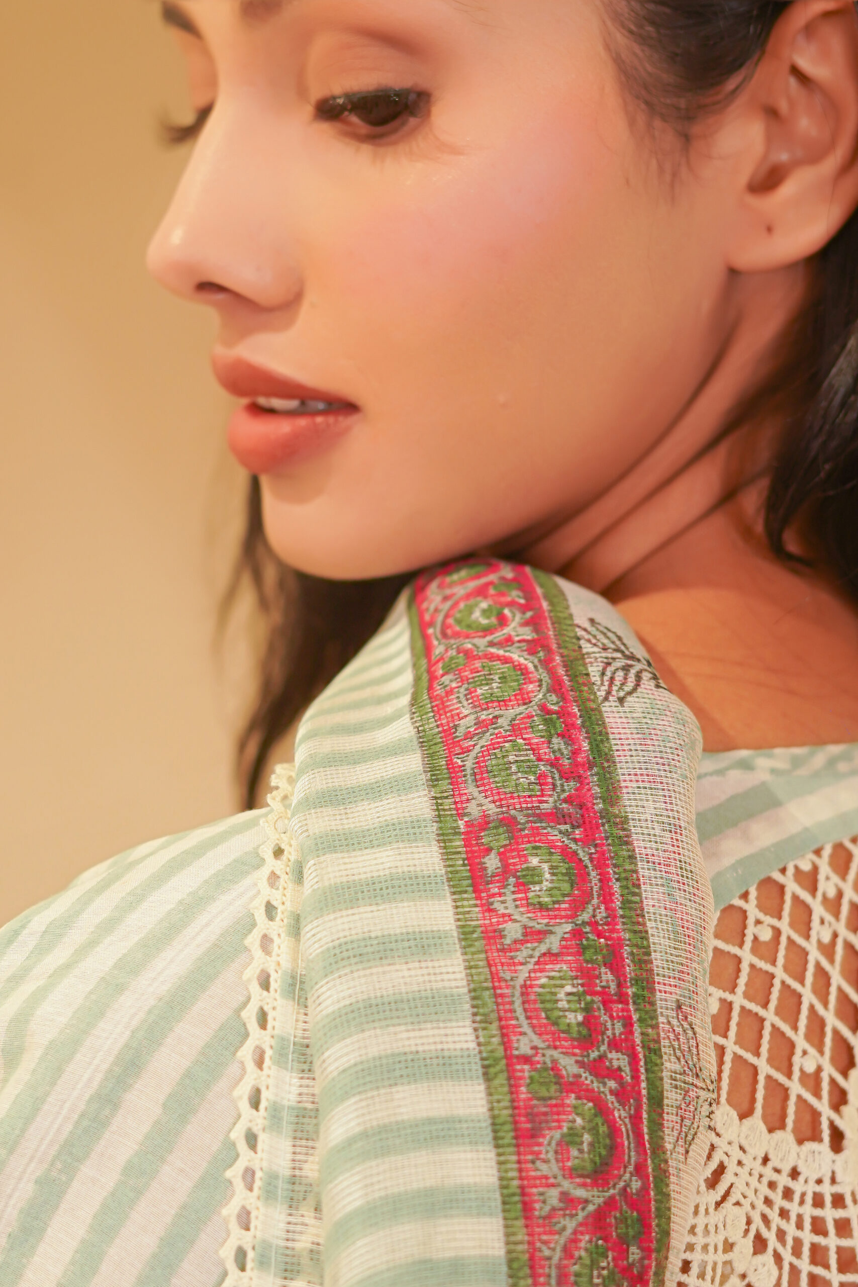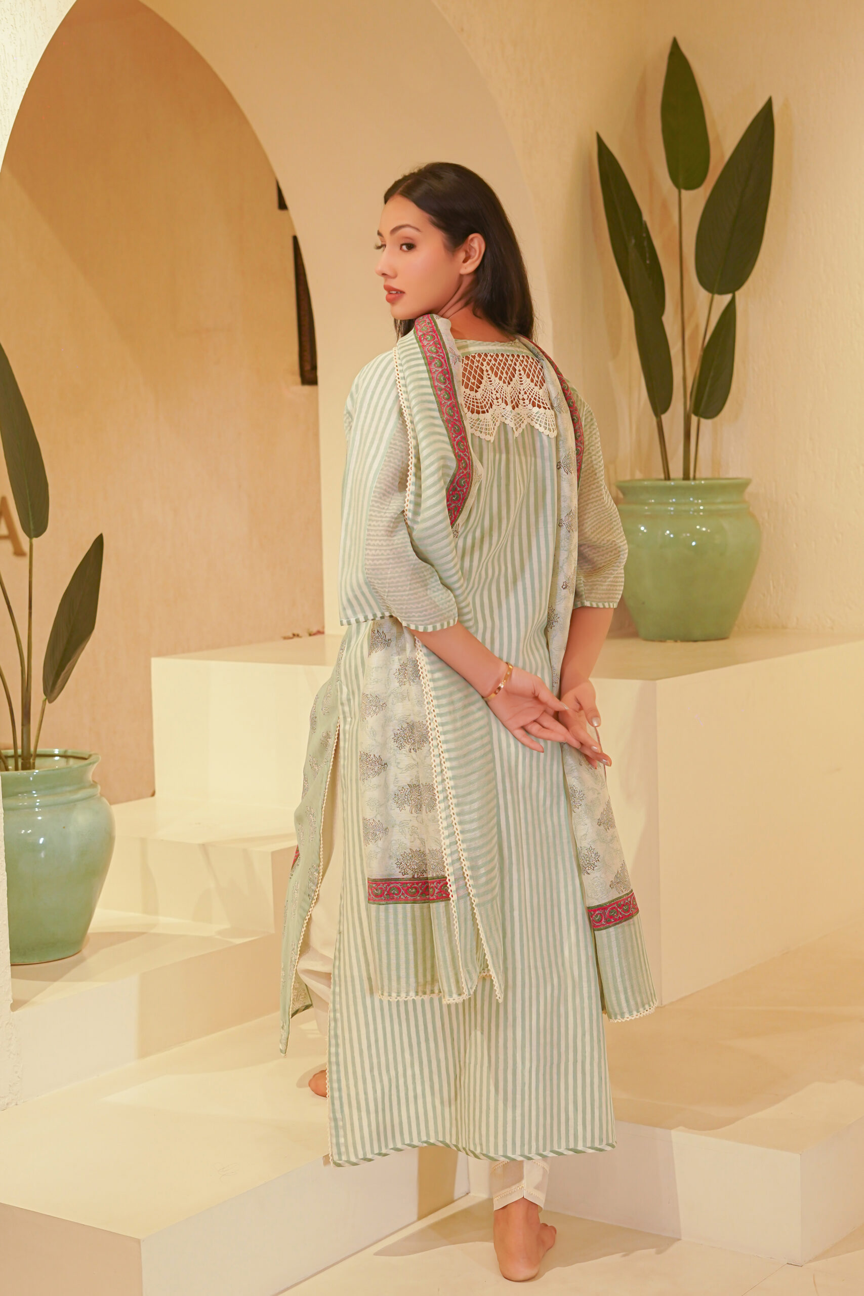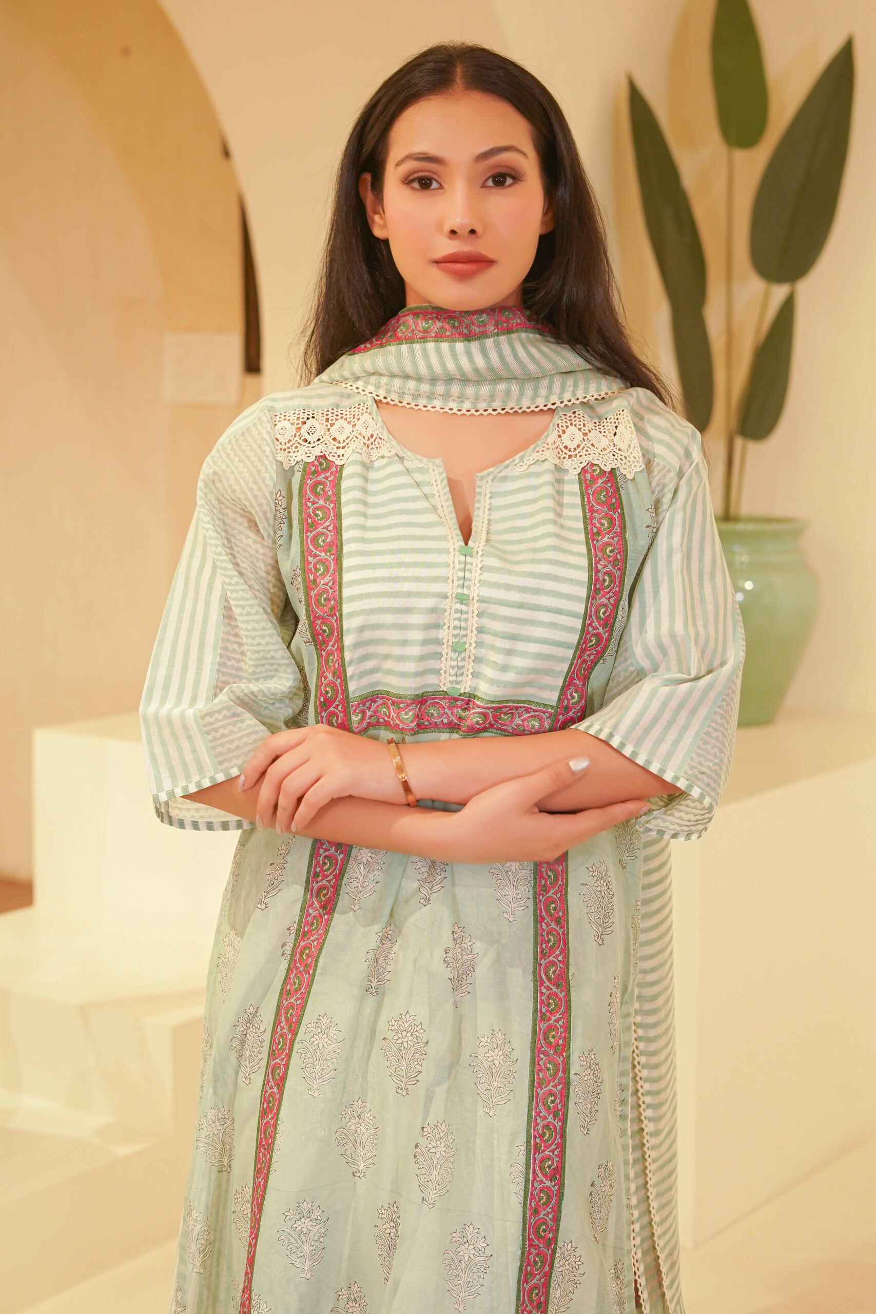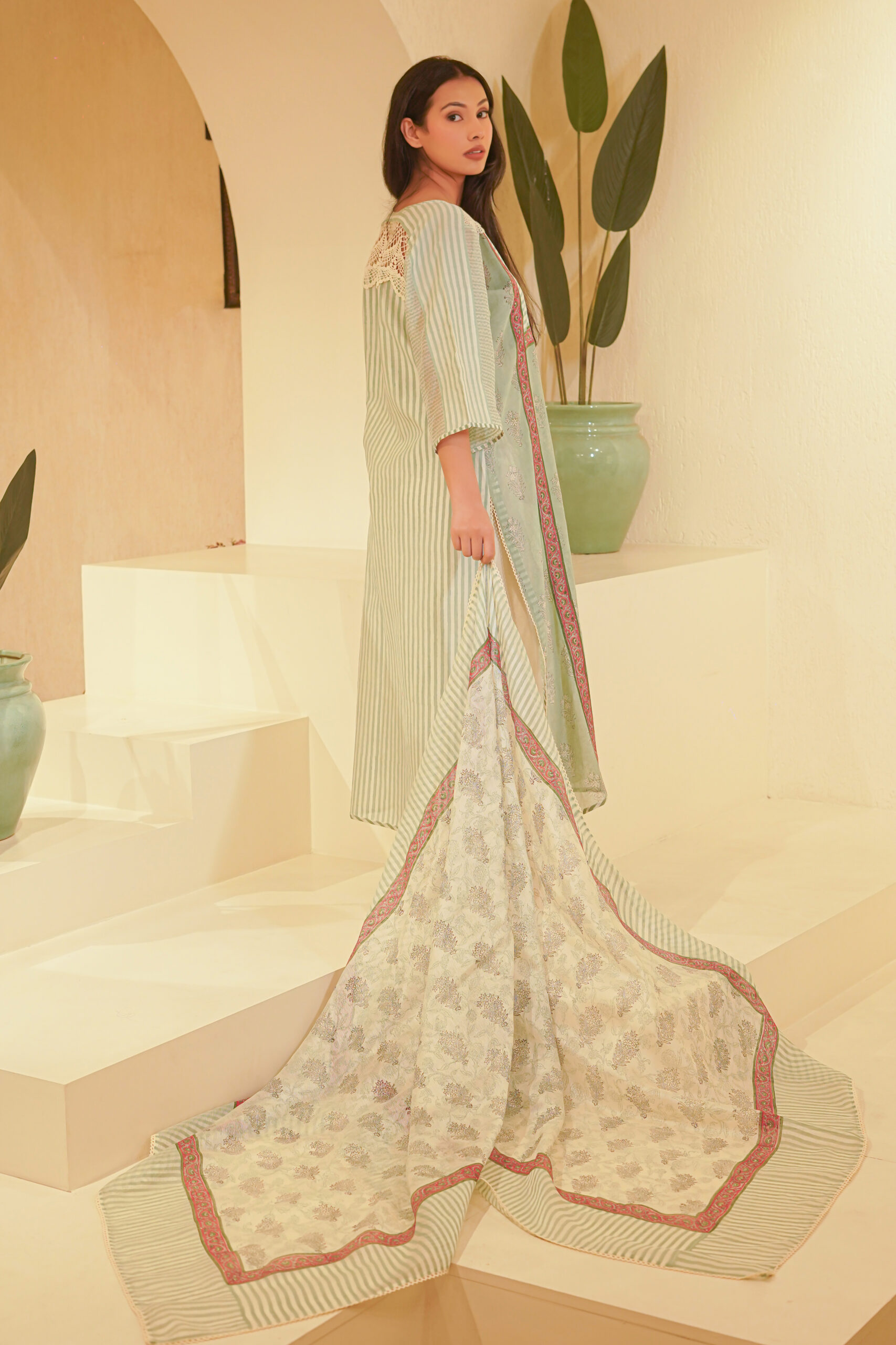 - Hand block print and lace details.