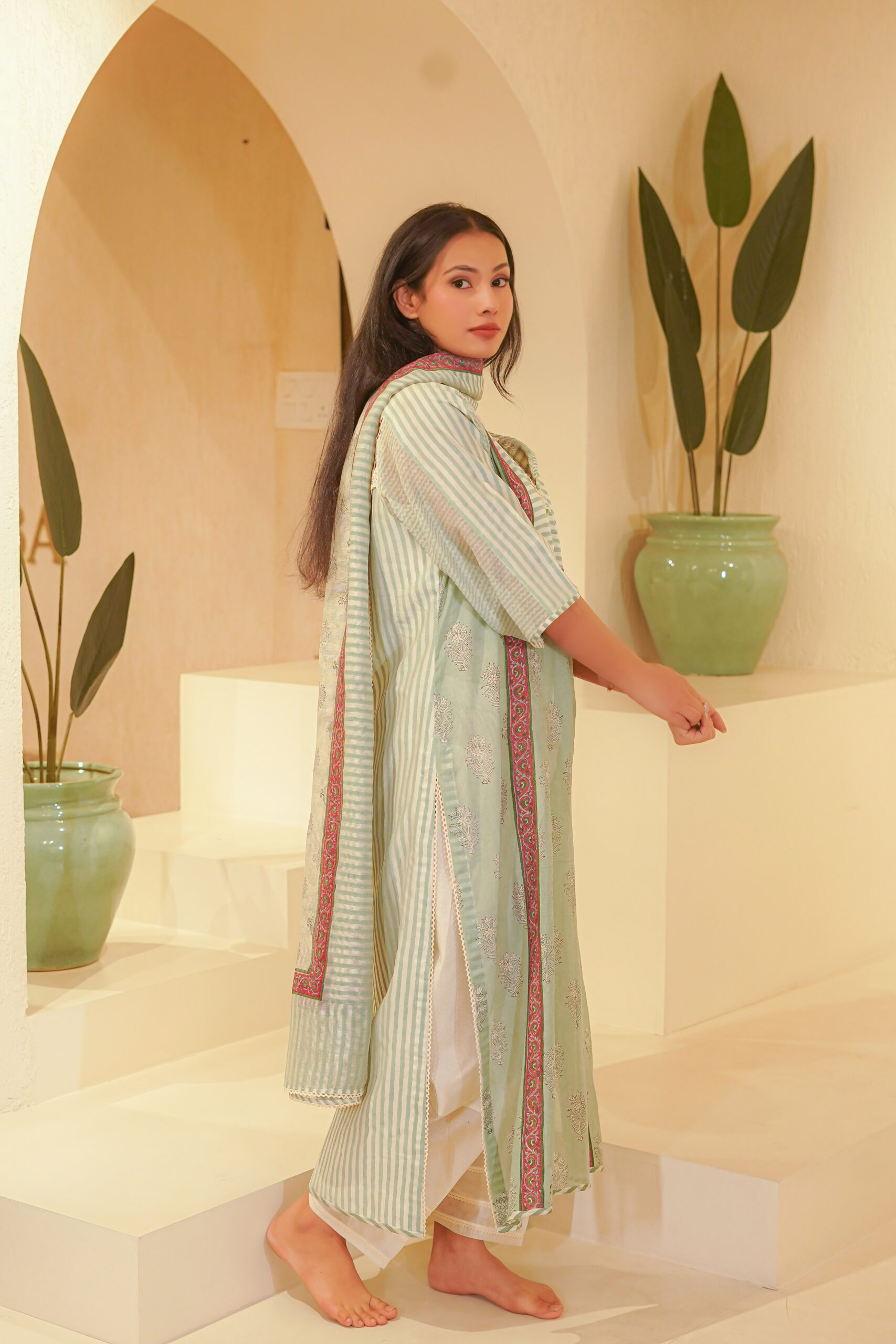 - Bottom : Hand block printed straight salwar in 70g Chanderi
